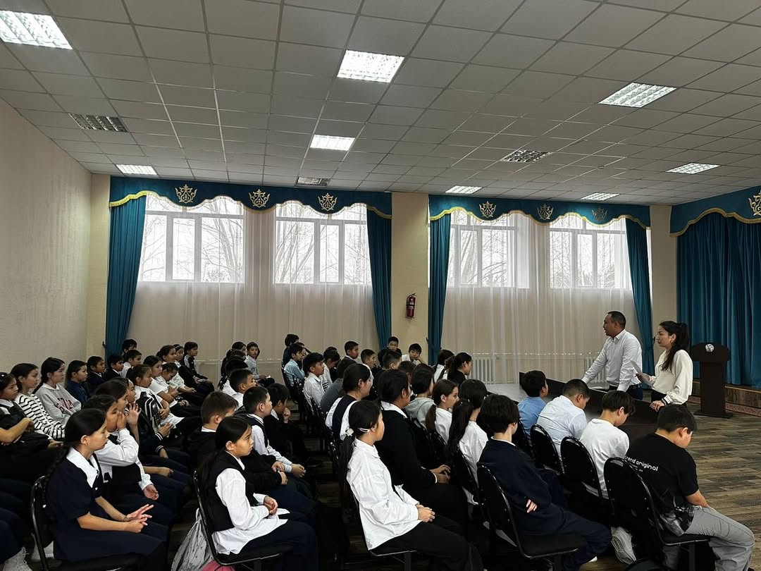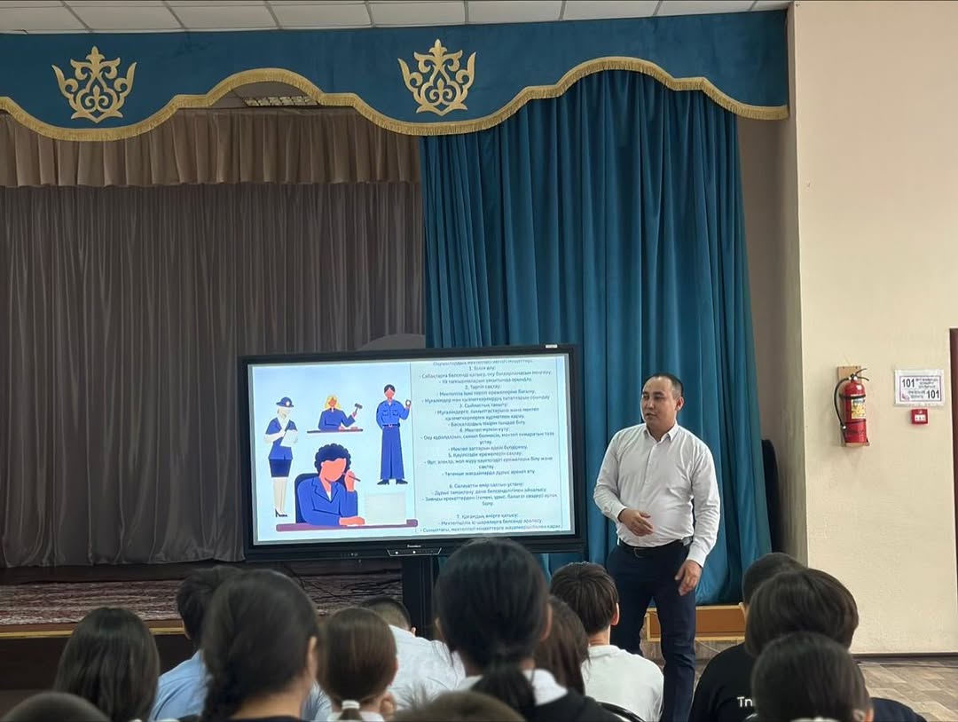 Бүгінгі күні мектеп психологы Мергенова Ж.С және әлеуметтік педагогы Шынтеміров Е.Ғ 5-7 сынып оқушыларымен «Заң және тәртіп» акциясы аясында оқушының міндеттері, мектептің ішкі тәртібі мен ережелері, заң нормалары, буллинг, кибербуллинг тақырыптарында түс