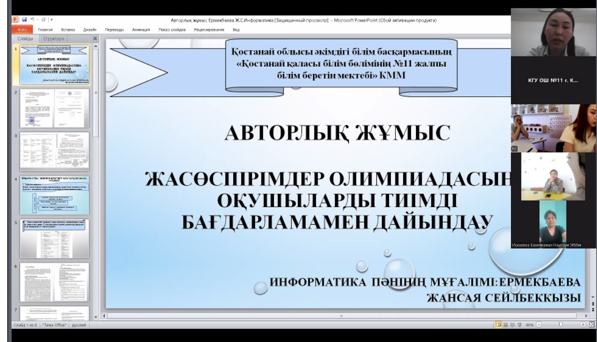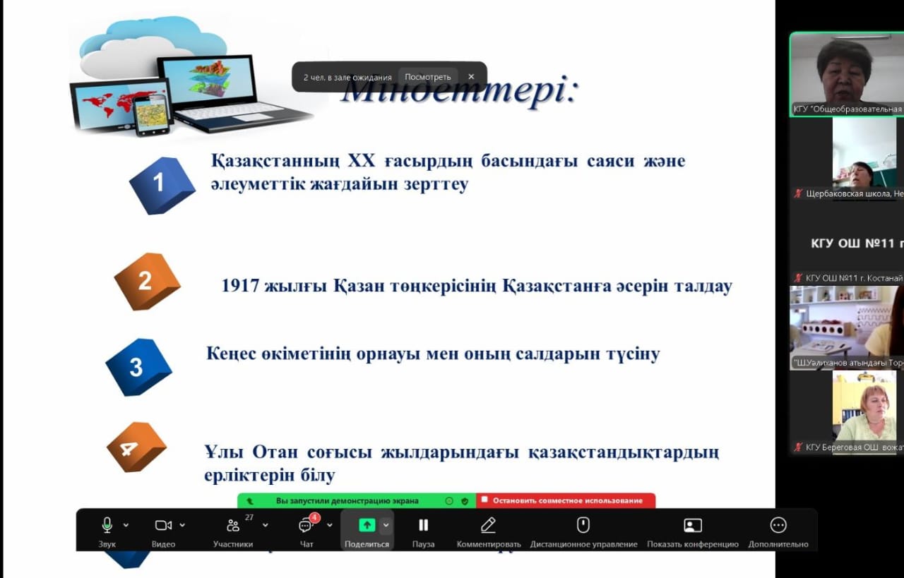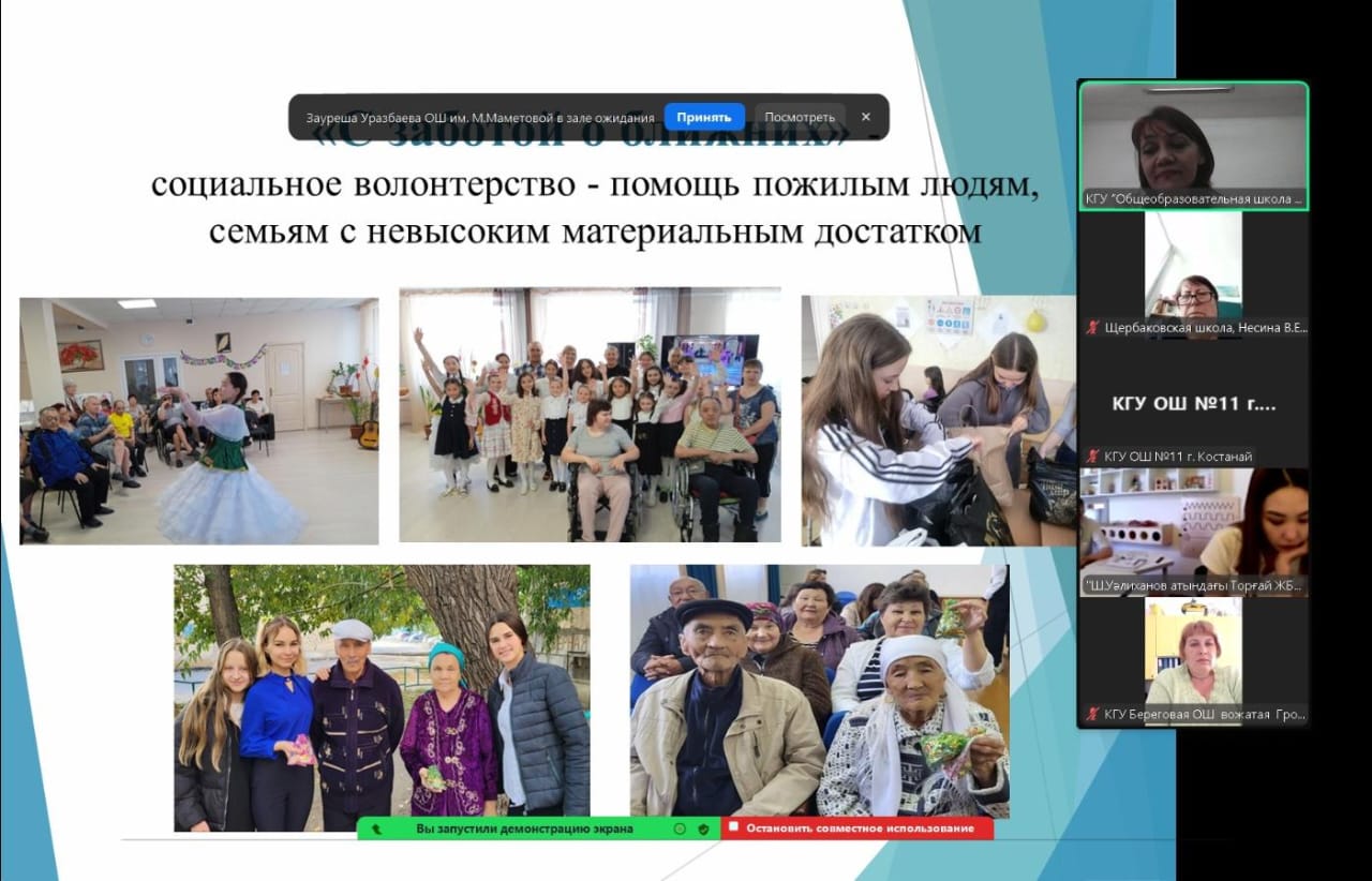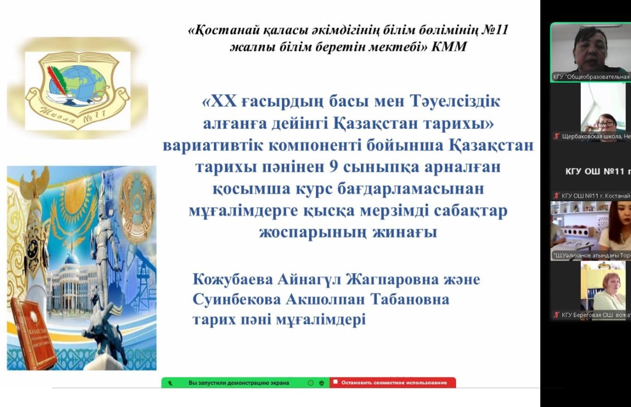 «Қостанай облысы әкімдігі білім басқармасының» КММ–нің «Оң педагогикалық тәжірибені негізінде тәжірибені тарату туралы» 16 сәуір 2025 жылғы №304 бұйрығына сәйкес 24 сәуір 2025 жылы сағат 15.00-де Қостанай облысы әкімдігі білім басқармасының «Қостанай қаласының білім бөлімі» ММ-нің әдістемелік кабинеті Қостанай облысы әкімдігі білім басқармасының «Қостанай қаласының білім бөлімінің № 11 жалпы білім беретін мектебі» КММ-мен бірлесе отырып, Ермекбаева Жансая Сейлбеккызы, информатика пәнінің мұғалімі «Жасөспірімдер олимпиадасына оқушыларды тиімді бағдарламамен дайындау» информатика пәнінен элективті курс, Роcлик Оксана Леонидовна, бастауыш сынып мұғалімі – «Дүниетануға арналған электронды 2 сынып оқу құралы» Екінші сынып оқушысының электронды көмекшісі, Сынабаева Акмарал Мусатраковна, педагог-психолог - «Өзіңді тани біл» 5-7 сынып оқушыларына арналған психологиялық – дамытушылық бағытындағы бағдарлама, Жунусова Марина Яковлевна, қосымша білім беру педагогы – «Жақсылық жаса» мектеп еріктілер қозғалысының бағдарламасы, Кожубаева А.Ж., Суинбекова А.Т., тарих пәнінің мұғалімдері - «XX ғасырдың басы мен Тәуелсіздік алғанға дейінгі Қазақстан тарихы вариативтік компоненті бойынша Қазақстан тарихы пәнінен 9 сыныпқа арналған қосымша курс бағдарламасынан мұғалімдерге қысқа мерзімді сабақтар жоспарының жинағы».