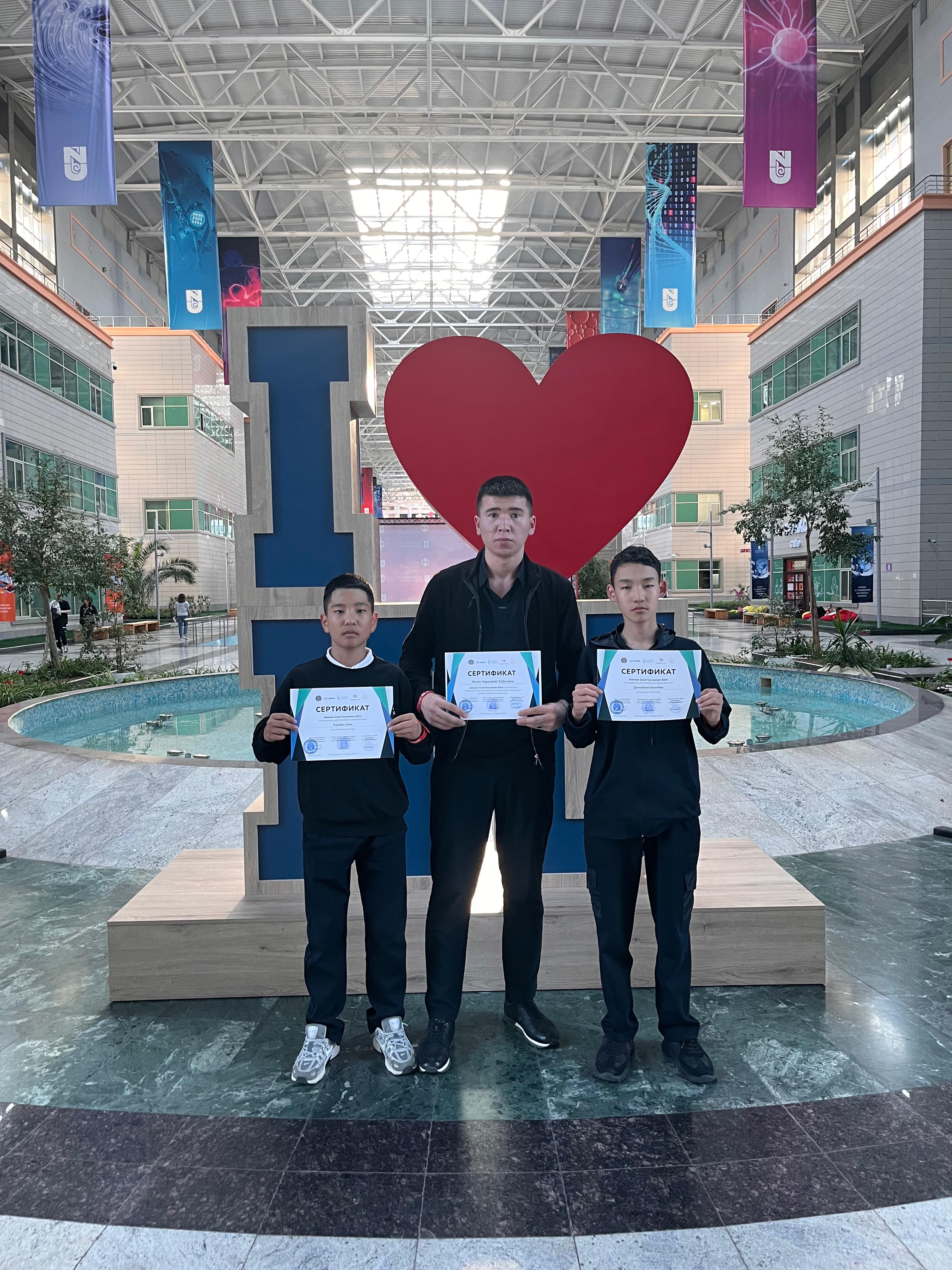 мектебіміздін 7 сынып окушылары Дуненбаев Болатбек, Карабек Диас жане жетекшісі Мелік Нурдэулет