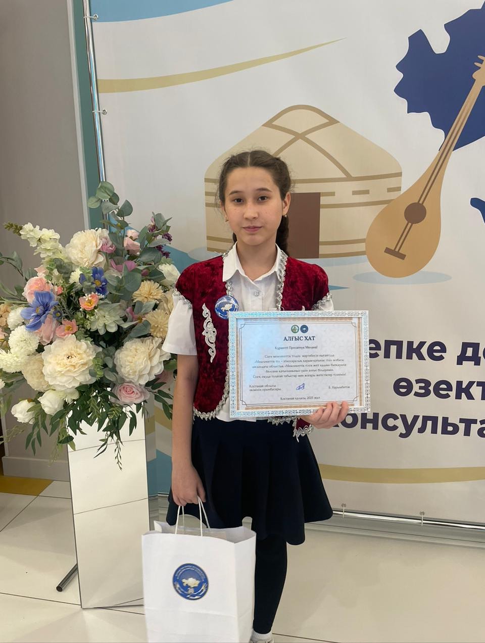 Оқушымыз Милана мен 3 ай бойы осы сайысқа дайындаған жетекшісі, қазақ тілі мен әдебиеті пәнінің мұғалімі Ахметқалиева Алмагүл Бақытбекқызы Қостанай облысы әкімінің орынбасарының алғыс хатын иеленді. Ұйымдастырушылардың айтуы бойынша, алдағы жылдың мамыр айында жетекшісі мен оқушы Амангелді, Жангелді аудандарына 10 күндік этно-мәдени жазғы лагеріне жіберілетіндігін айтты.