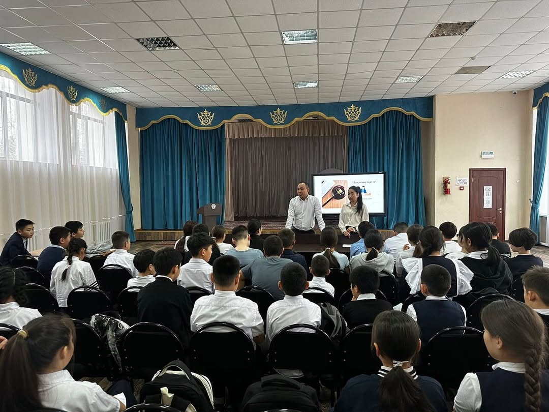 Бүгінгі күні мектеп психологы Мергенова Ж.С және әлеуметтік педагогы Шынтеміров Е.Ғ 5-7 сынып оқушыларымен «Заң және тәртіп» акциясы аясында оқушының міндеттері, мектептің ішкі тәртібі мен ережелері, заң нормалары, буллинг, кибербуллинг тақырыптарында түс